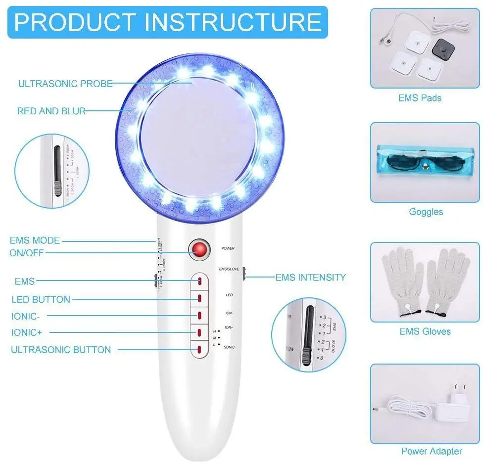 Big Deal 6 IN 11MHz Ultrasonic Infrared Red/Blue Light EMS LED Facial Care Massager for Body Waist Hip Legs